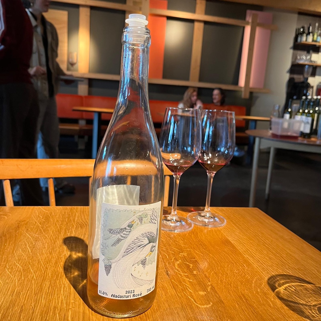 Rkatsiteli, orange wine; diffuus uiterlijk, transparant van smaak, levendig, spritzig, goede zuren en lengte (12%) € 21,00