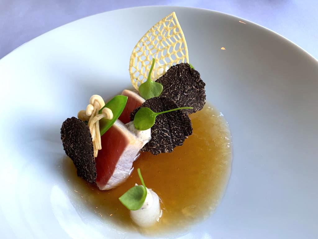 Heel fris ogend gerecht, ruikt en smaakt hetzelfde. Mooie balans tussen vis en groente, licht verteerbaar. Het aroma van de enoki-paddenstoelen is mooi verweven, de truffelconsommé is bijzonder mooi van smaak en de sugar snaps voegen een zoetig accent toe. De fijn gedoseerde, flinterdunne verse truffel in dit gerecht zorgt voor een aangenaam nootachtig smaakaccent en een licht crispy beleving. Al met al een mooi geheel, divers qua smaken en structuren.