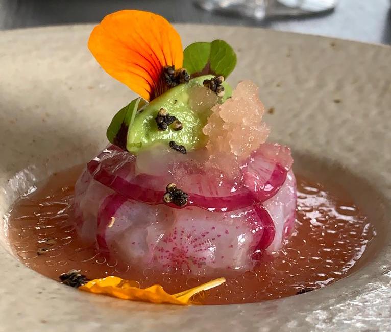 Tartaar van zeebaars bereid als ceviche, groene radijs, gefermenteerd tomatensap, granité van grapefruit, gepofte quinoa. Levendig en evenwichtig gerecht met aangenaam frisse zuurgraad.