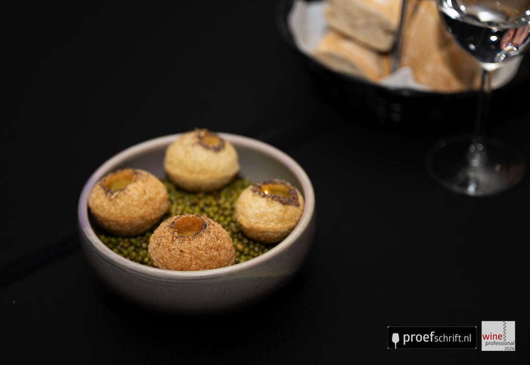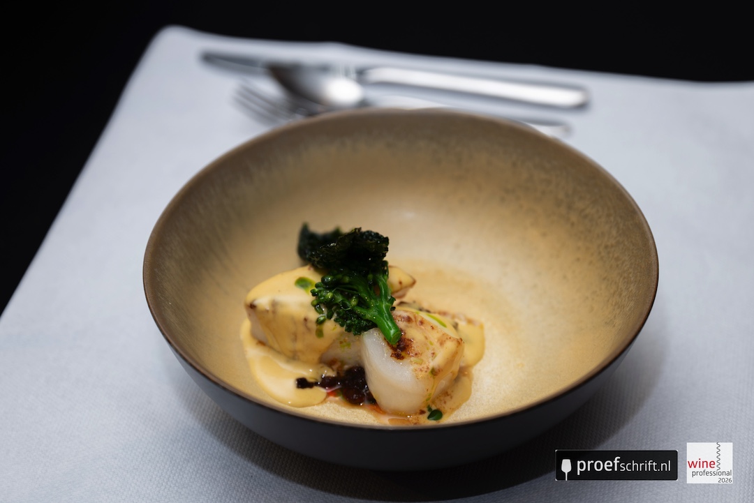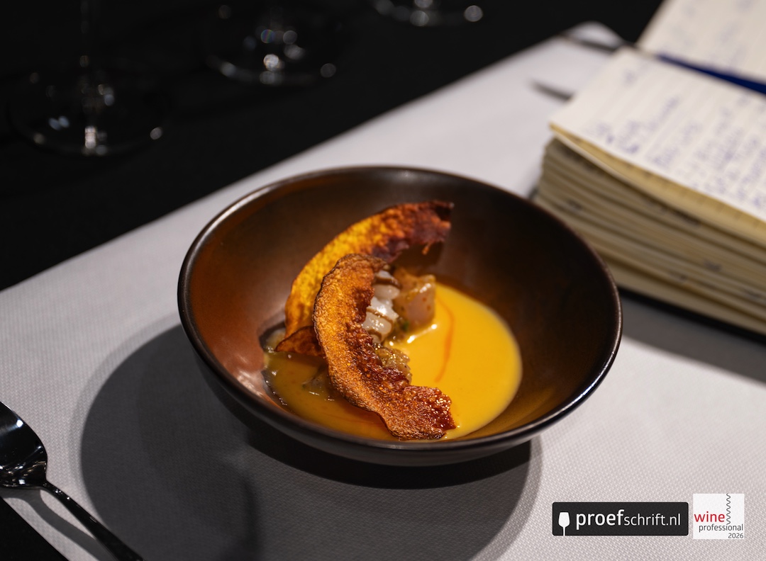 Verfrissend geheel met de wijn, die hier ook een licht bluseffect heeft vanwege de pittige ondertoon van de amuse. Aangename zuren, heel schoon en verleidelijk.