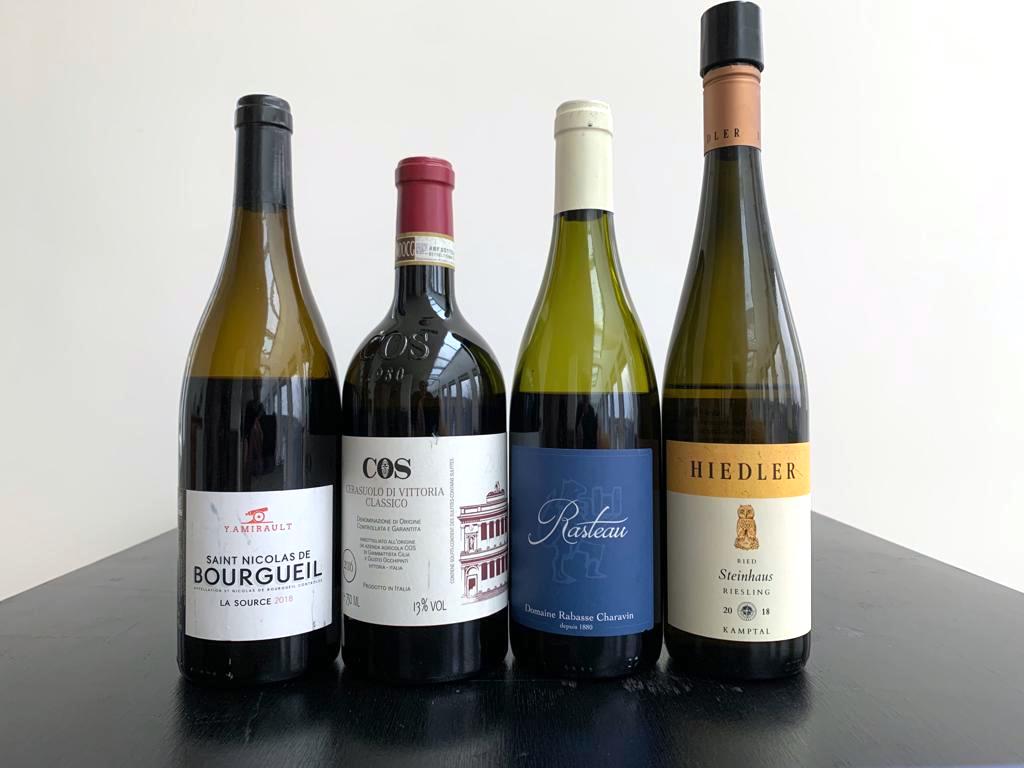 Grenache, mourvèdre, carignan, biologisch; correcte kleur met wat ontwikkeling aan de rand, warme geurtonen, goede blend van drie druiven, evenwichtige geur en smaak, mooi gerijpte aroma’s, goede fruittonen in combinatie met frisse zuren, fraai ontwikkeld, doet het heel goed aan tafel, een van de opvallende vondsten onder de Wine Professional Boxwijnen, prachtige wijn (15%)€ 21,75 - COS, Cerasuolo di Vittoria, Italië 2016