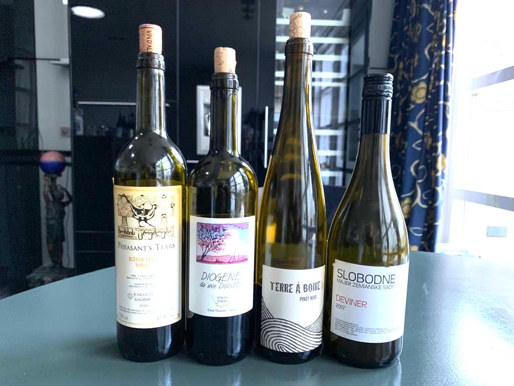 Khikhvi, vin nature, orange wine; oranje tot heel licht amberkleurig, toegeknepen maar intense geur, compacte aroma’s in geur en smaak, impressies van sinaasappel en noten, sappig, goede inhoud en vulling, evenwichtig, lichte toets van boenwas en bittertje in de finale, mooie lengte, zeer goed inzetbare gastronomische wijn (12,5%) € 16,00